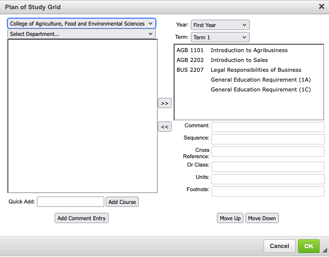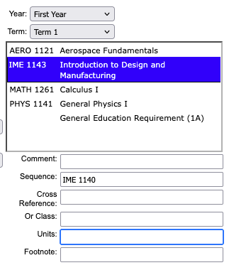 - Units = will automatically populate units associated with course added, may appear blank for when sequence field is used to show combined total of units in the table.