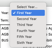 - Select the course that you want to add from the list and choose the double arrow icon to add it to the corresponding Year and Term section.