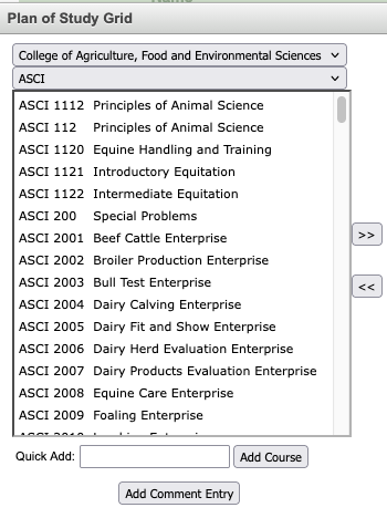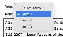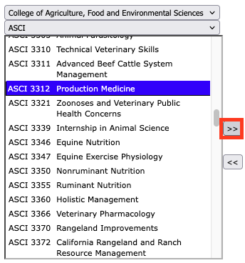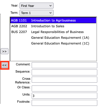 - Select the Year and Term corresponding with the course that should be removed. Select the Course (ex. AGB 1101) and hit the double arrow icon to remove it from the list.